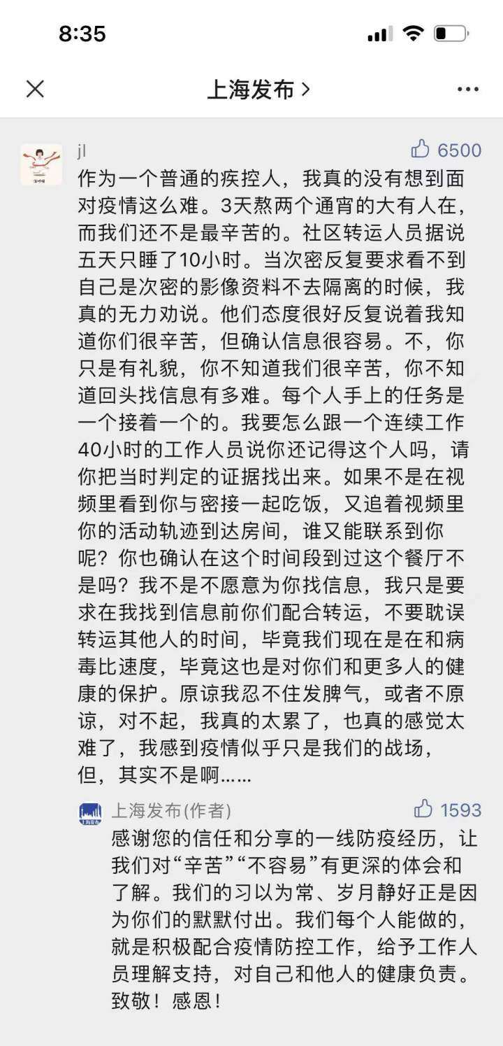今天上午,“上海发布”微信公号上,一位微信名为“jl”的疾控工作人员的留言,获得最高点赞。翻看其他网友的留言也可发现,几乎全都是安慰的话,还有的网友没有多余的话,只是想给对方一个“抱抱”。