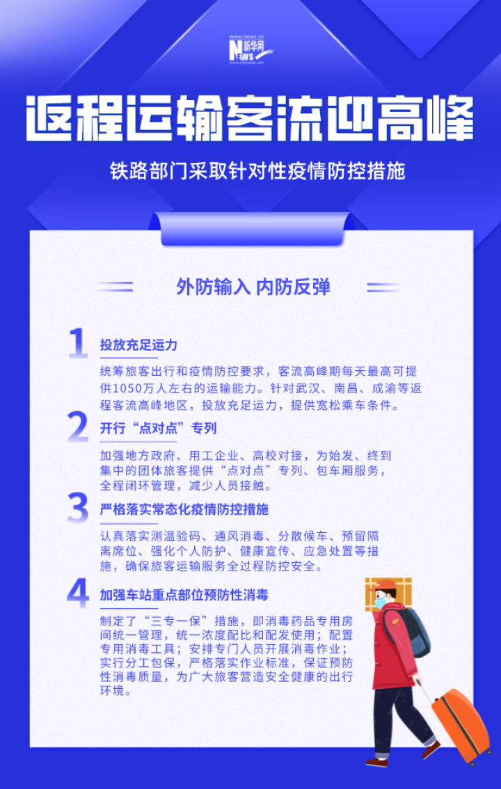 针对返程运输高峰出行情况,伍世平介绍,铁路部门采取了有针对性的疫情防控措施,具体如下: