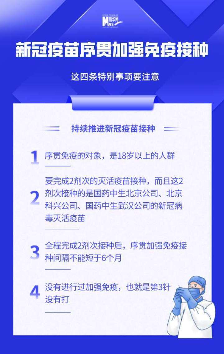 除去以上四条特别注意事项以外,王华庆也提醒大家,进行序贯加强免疫接种,跟过去我们接种新冠疫苗的注意事项一样,包括接种之前要了解当地接种的相关规定,接种时要做好个人防护,要把自己的健康状况如实向接种医生反映,接种后要留观30分钟,发生怀疑与疫苗接种有关的不良反应时,如持续时间较长,症状比较严重,要向接种单位报告,及时就医。
