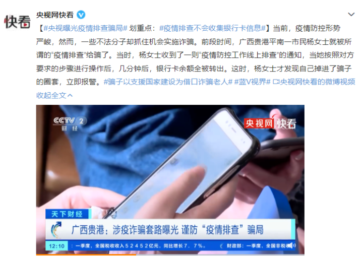 当前,疫情防控形势严峻,然而,一些不法分子却抓住机会实施诈骗。前段时间,广西贵港平南一市民杨女士就被所谓的“疫情排查”给骗了。当时,杨女士收到了一则“疫情防控工作线上排查”的通知,当她按照对方要求的步骤进行操作后,几分钟后,银行卡余额全被转出。这时,杨女士才发现自己掉进了骗子的圈套,立即报警。