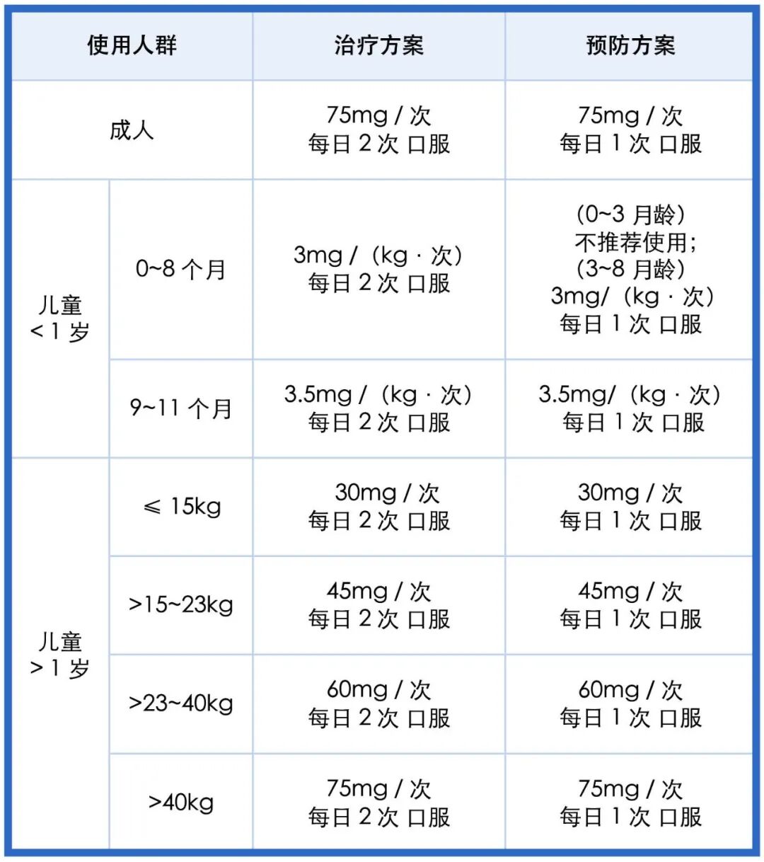 05 奥司他韦啥时候吃?怎么吃? 确诊甲流/乙流,越早吃越好。 一般建议48小时内服用,服用5天(期间即使症状缓解也不建议停药)。 当然,如果病情严重,住院患儿,或有发生并发症的高危因素,就算超过48小时仍然可以使用。 目前,市面上的奥司他韦主要有: 磷酸奥司他韦胶囊(规格:75mg/粒) 磷酸奥司他韦颗粒(规格:15mg/袋;25mg/袋) 磷酸奥司他韦干混悬剂(规格:12.5ml: 75mg) 三种剂型均可用于儿童。 不过,磷酸奥司他韦胶囊一般建议整粒吞服,更适合成年人;而磷酸奥司他韦颗粒和干混悬剂需要用温水溶解后服用,更适合儿童。 ▲ 不同年龄人群奥司他韦治疗及预防适用剂量