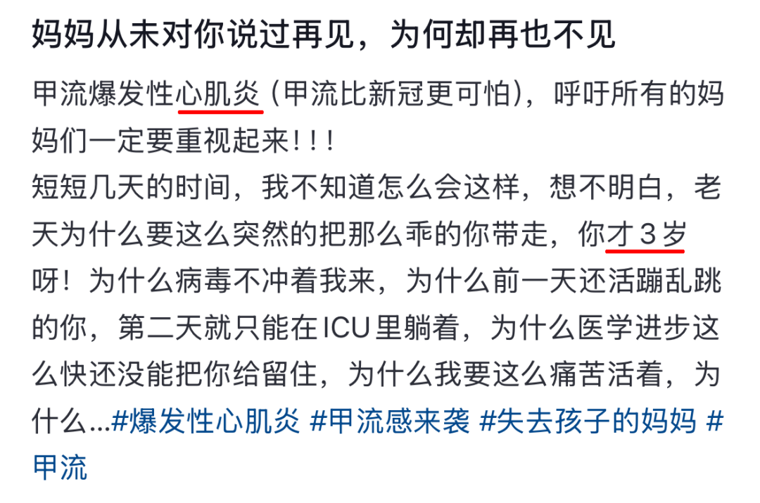 从临床上来看,甲型H1N1、甲型H3N2主要症状都是发热、咳嗽、咽痛,全身的酸痛、乏力和头痛都比较明显。 它们之间最大的不同,是对不同年龄感染者的影响—— 甲型H3N2,对老年人威胁更大,可导致更严重的症状、更长的恢复时间。 甲型H1N1,对儿童、年轻人的影响比较明显,伴有呕吐或腹泻等消化道症状的概率也大一些。但并不意味着对老年人“友好”。 02 得了甲流,要不要紧? 可大可小。 健康的人患上甲流后,大多是轻症。 一般,没有并发症的甲流患者,症状在3~7天缓解,但咳嗽和体力恢复常常需要1~2周。 但是,部分感染者可能会出现肺炎、心肌炎、脑炎等并发症。甚至可能进展为重症,危及生命。 特别要提醒的是,年龄<5岁的孩子(尤其是2岁以下)较易发展成重症。 至于有基础疾病的孩子(如哮喘、肾病、恶性肿瘤、免疫功能低下、肥胖等),更不用说,也是易患流感并且容易出现严重并发症的高危人群。