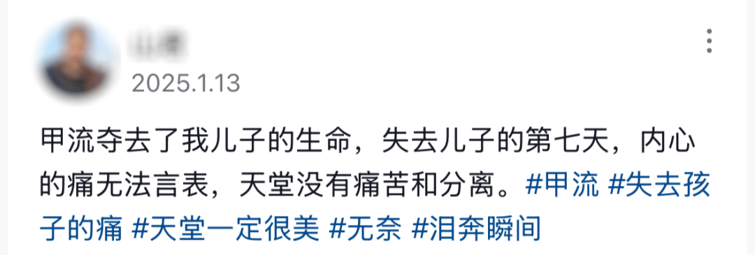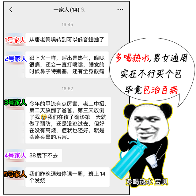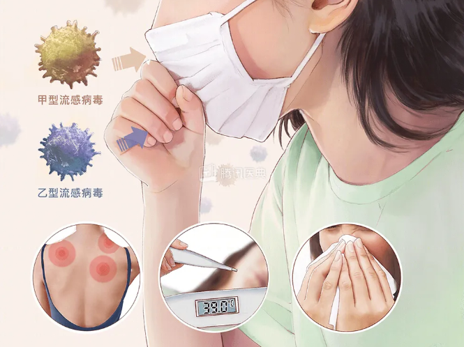 所以,千万千万别大意: 流感≠普通感冒,流感≠大号感冒。 03 孩子哪些症状,可能是甲流? 这些甲流症状,孩子可能不会表达,但宝爸宝妈要知道—— ① 发烧 起病急,迅速发展为高热,体温可高达39℃~40℃,可能反复持续3~5天。可能出现怕冷、寒战、手脚冰凉、头痛等。 图源:小红书用户“扭扭” ② 喉咙不舒服 大孩子会说喉咙干、痒、痛,而小孩子可能表现为容易哭闹或者怕吃东西,尤其是固体类食物。 ③ 鼻塞打喷嚏 打喷嚏,流鼻涕,鼻塞等。小孩子可能会表现为哭闹、呼哧声、张口呼吸或打呼噜等。 ④ 咳嗽 大多是阵发性的,不是咳个不停。每次咳嗽声数可能不是很多,但会比较频繁,大多是干咳。 图源:腾讯医典 ⑤ 其他不适 大孩子可能会说头痛、全身肌肉酸痛、乏力,还会伴有呕吐、腹痛或者腹泻等。小孩子则容易表现为哭闹、粘人。 这些症状,可能会都出现,但也可能只出现几项。 年龄越小的孩子,症状往往越是不典型。 图源:丁香医生