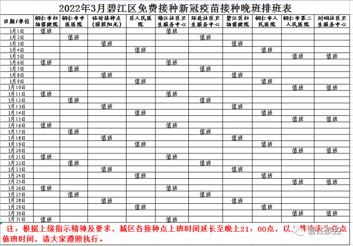 2022年3月碧江区免费接种新冠疫苗接种晚班排班信息