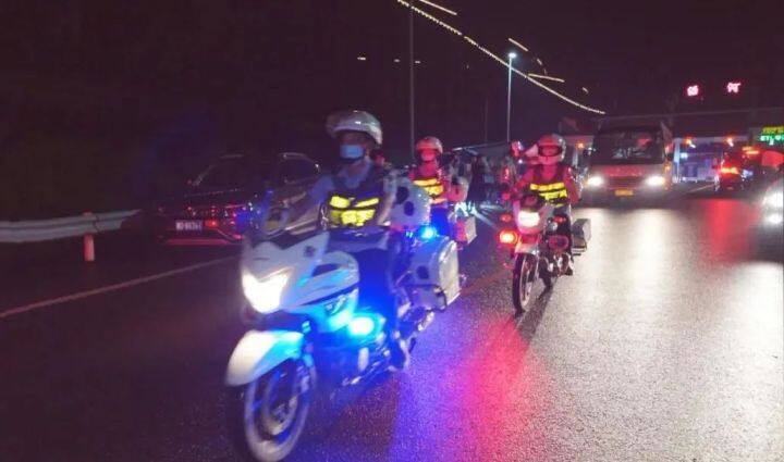 晚上8点40分,在沿德高速沿河西收费站,载着援沪医务人员的中巴车缓缓驶出高速收费站。骑警队伍整齐列队,家人、朋友们满怀期待,迎接他们的归来。