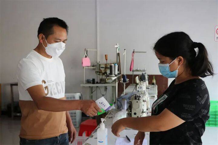 "以前也是在外务工,但要照顾孩子,再加上疫情的原因,去年车间开设后我就开始来这里上班。这里离家比较近,而且工资是按计件算,平常家里有事请假也方便。现在每天来上班都要测体温、扫码,也是为了自身的健康。"务工群众张燕华说。
