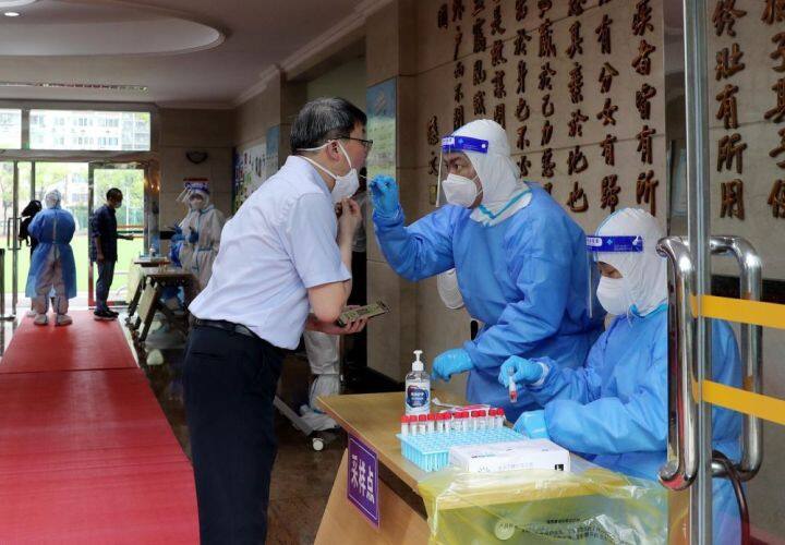6月5日,上海市大同中学的教师职工在进行每日核酸采样实操演练。 新华社记者 刘颖 摄